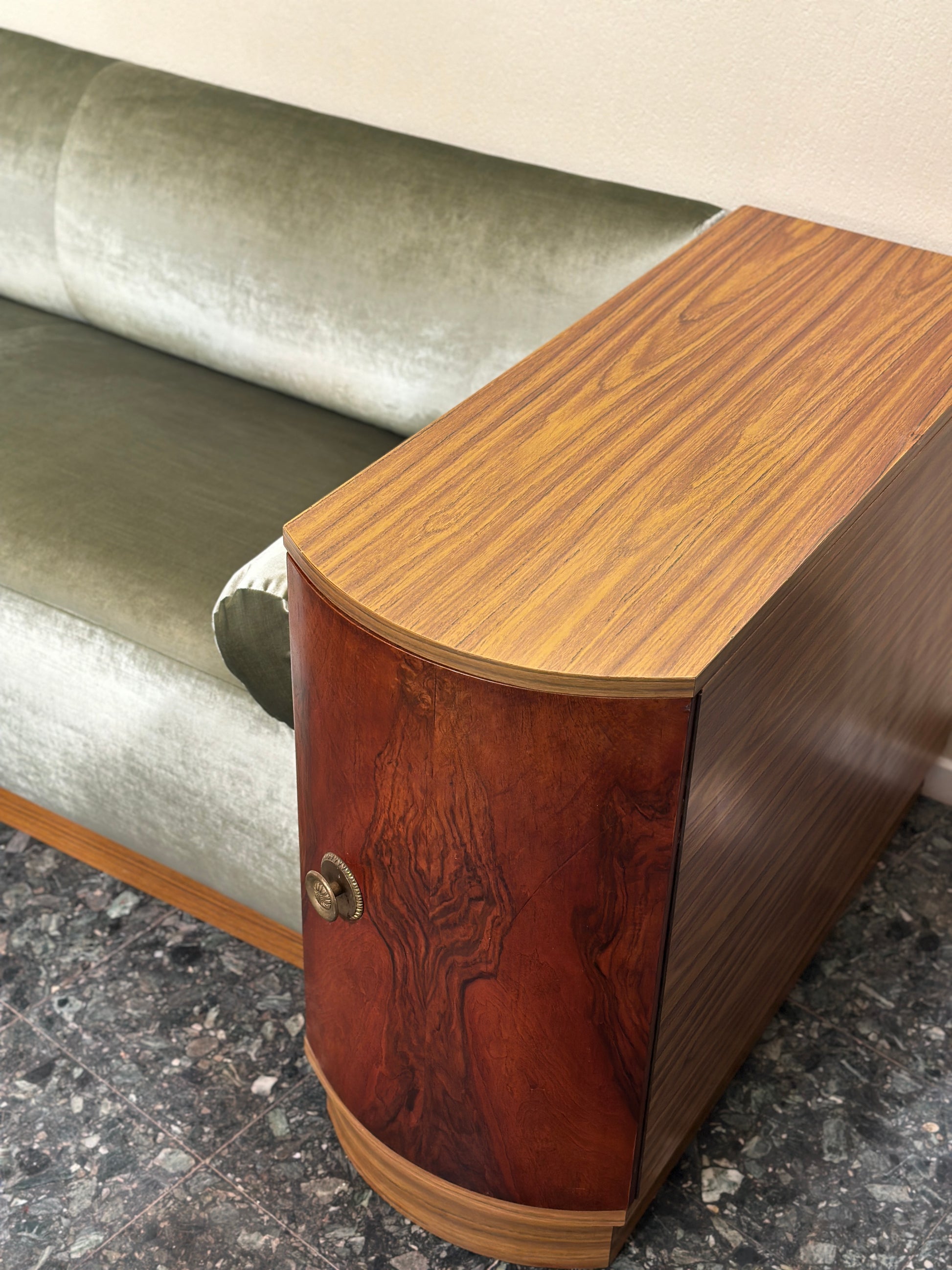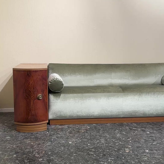 Architectural Art Deco sofa defined by its integrated cabinet ends, executed in walnut with expressive grain on the fronts.