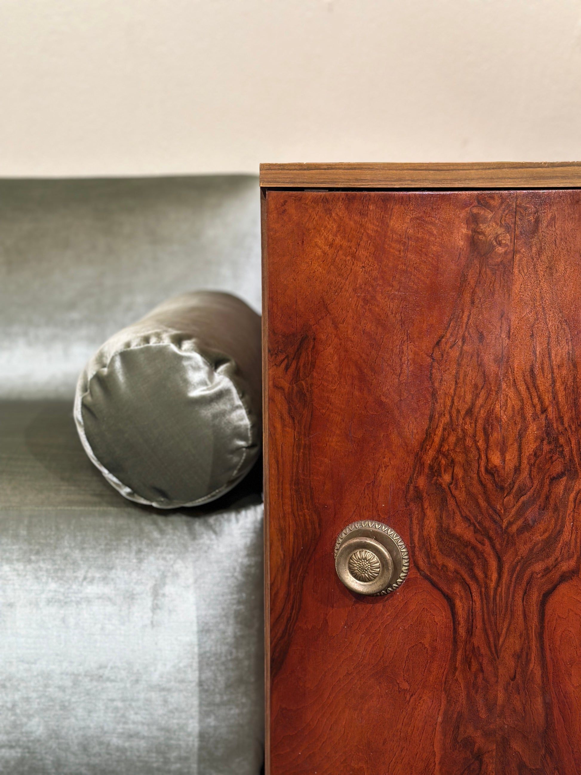 The composition is built from strong, geometric volumes with softened, rounded corners, typical of late Art Deco design. The contrast between the richly figured walnut fronts and the calmer linear grain on the sides adds depth and refinement.