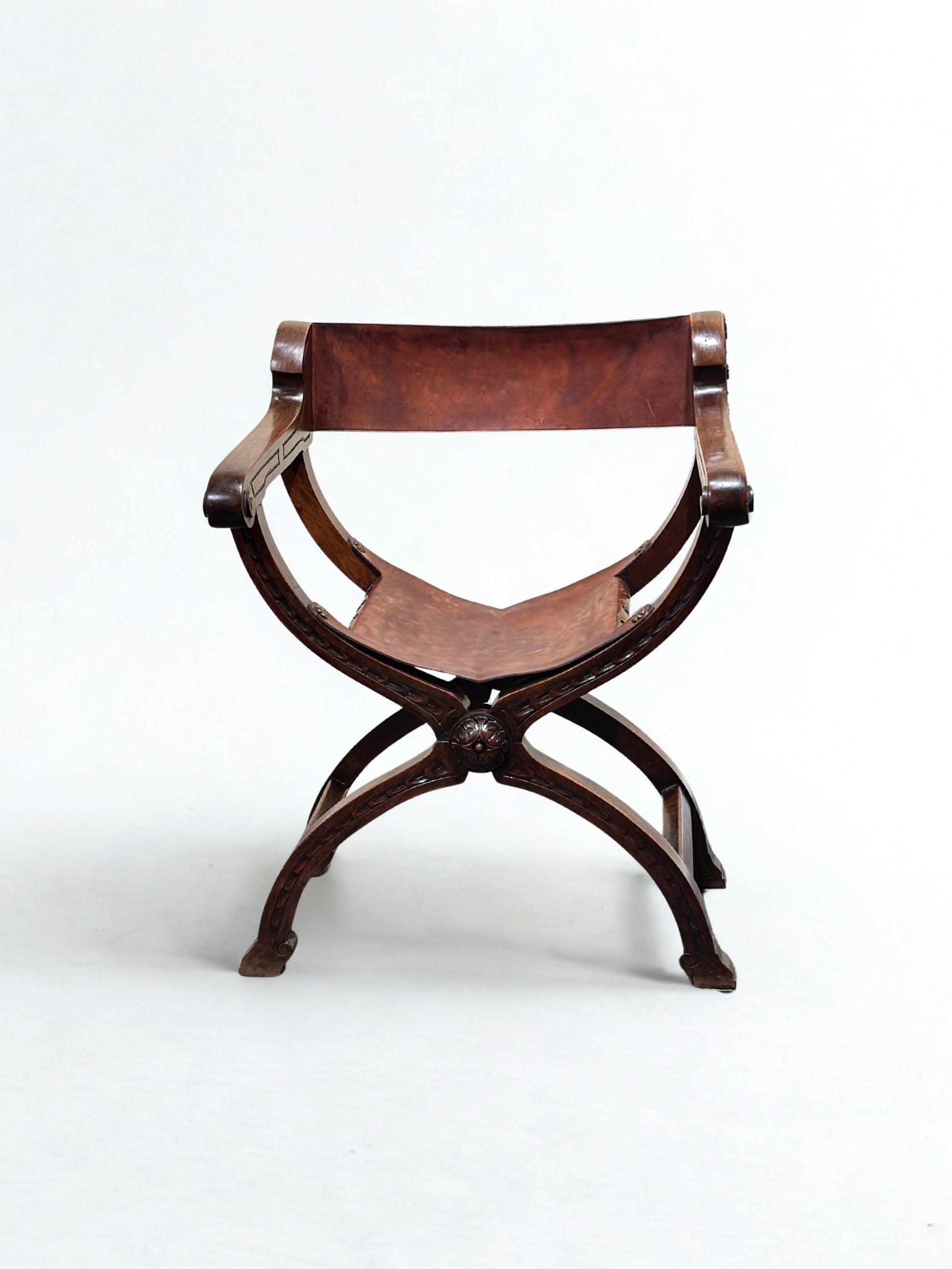 French-made Savonarola folding chair from the late 19th century. Features an X-shaped wooden frame with curved armrests, decorative metal rosettes, and a leather seat and backrest with original patina. Sturdy, foldable, and well-suited as an accent or occasional chair.