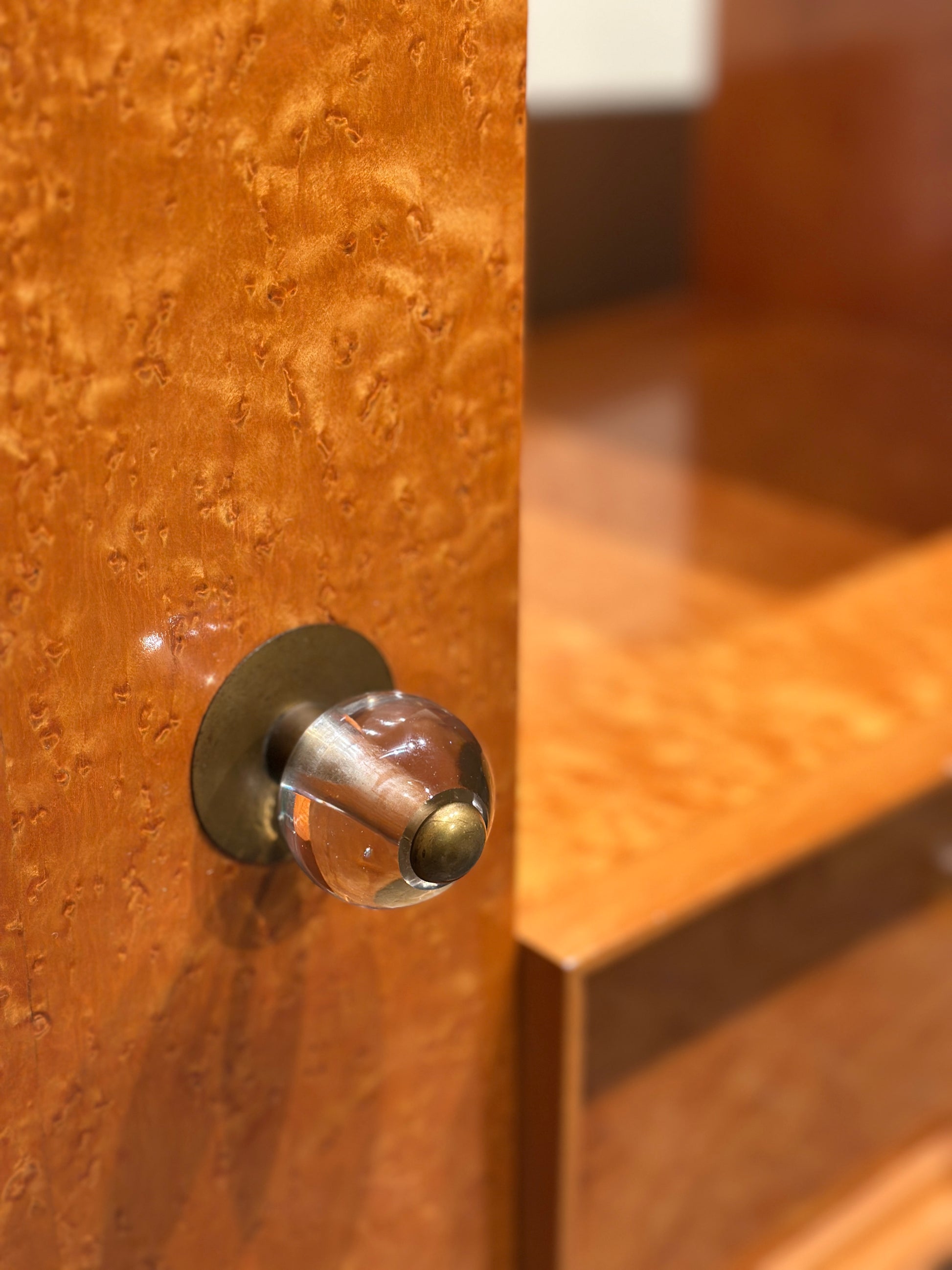 This original Art Deco sideboard from circa 1930 is finished in high-quality Birdseye Maple veneer, characterised by its fine decorative patterning and warm, honey-toned lacquer. The piece features clean, symmetrical lines, rounded edges and original glass knobs, all typical of the Art Deco period.