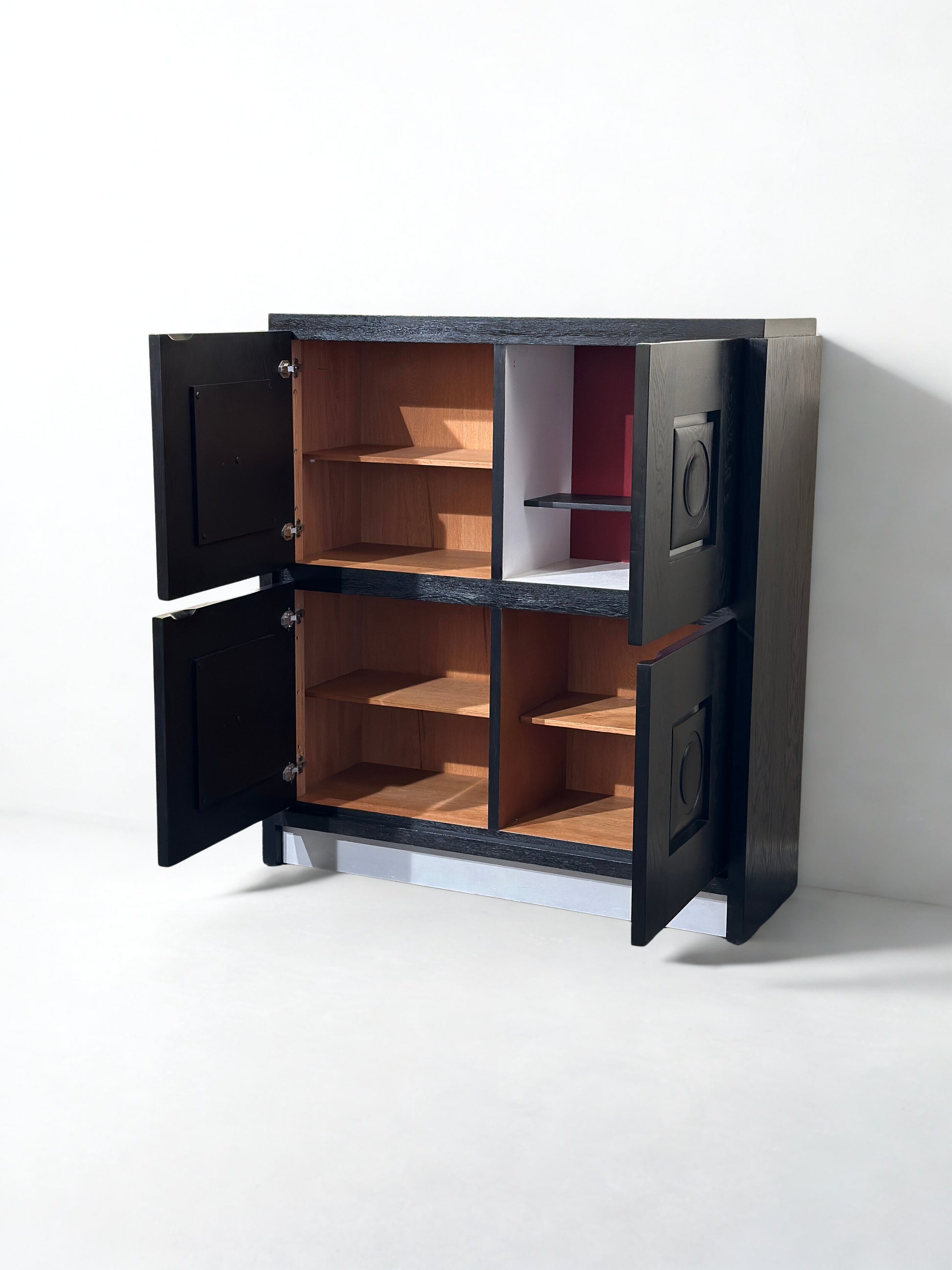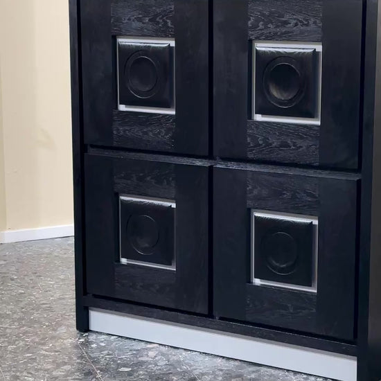 Each door features a recessed square frame with a circular central element, accentuated by silver-toned detailing, creating a strong geometric contrast and a subtle industrial edge.