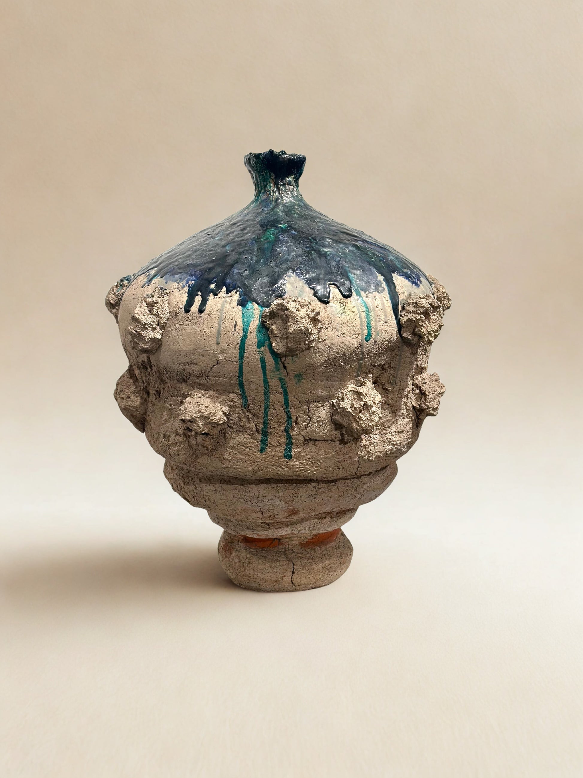 A unique set of handmade ceramic vessels featuring an expressive, sculptural shape and striking texture. Crafted in the 1960’s in Spain from coarse clay, each piece has a raw, tactile surface contrasted by playful accents of deep blue, black, and green glaze. The glaze drips organically from the top, creating a dynamic interplay between rough and glossy finishes.