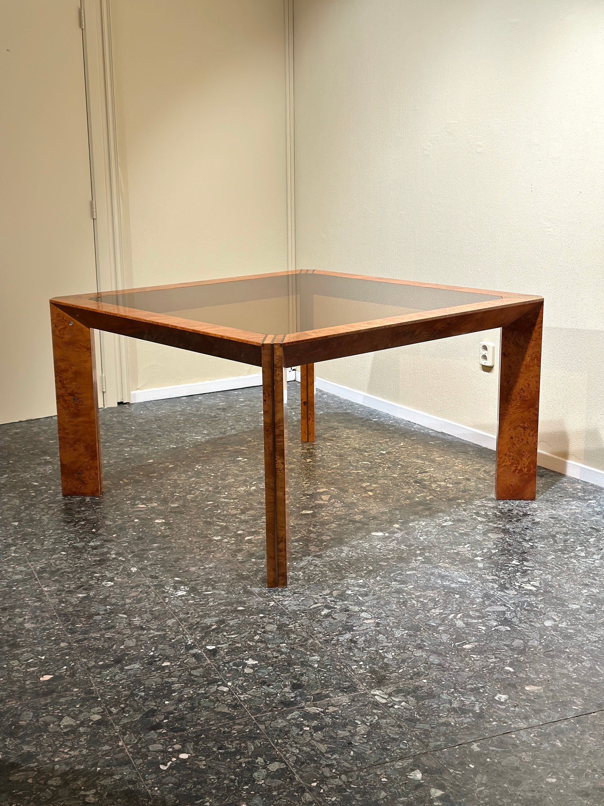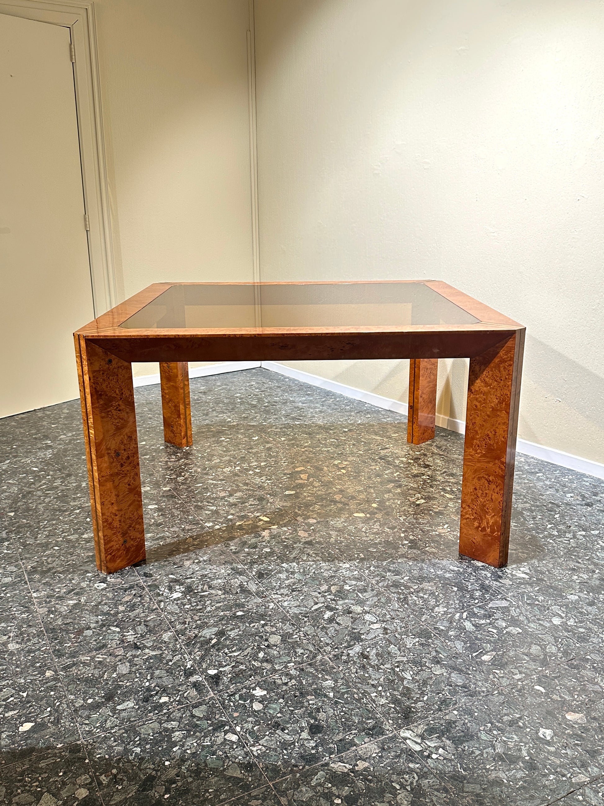 Vintage Italian diningtable designed in the Willy Rizzo style, featuring a high-gloss burlwood frame paired with a smoked-glass top. The table has a clean, geometric silhouette typical of 1970s Italian design.