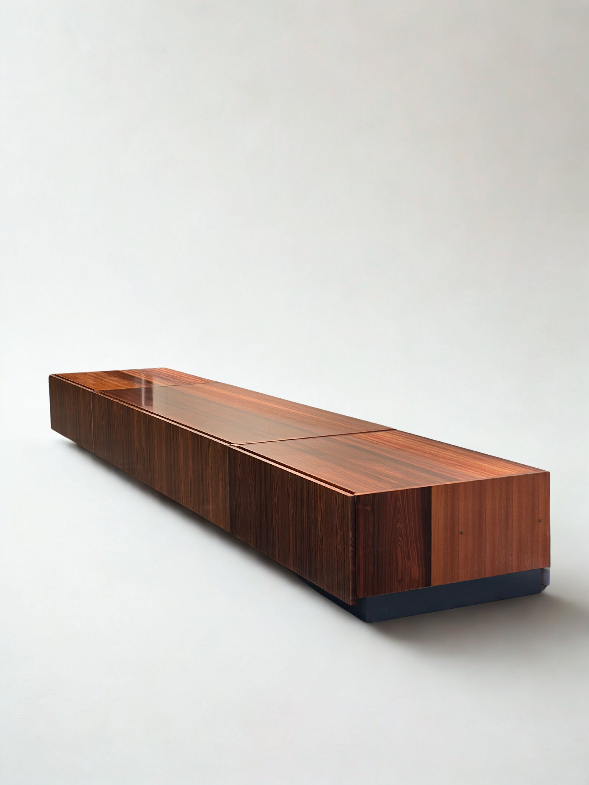 Impressive mid-century modern lowboard in beautifully grained rosewood veneer. This extra-long piece features a clean, minimalist design and a recessed base, creating an elegant floating appearance.
