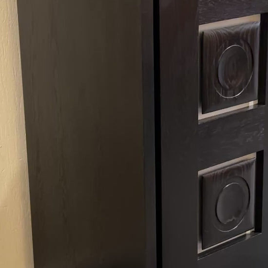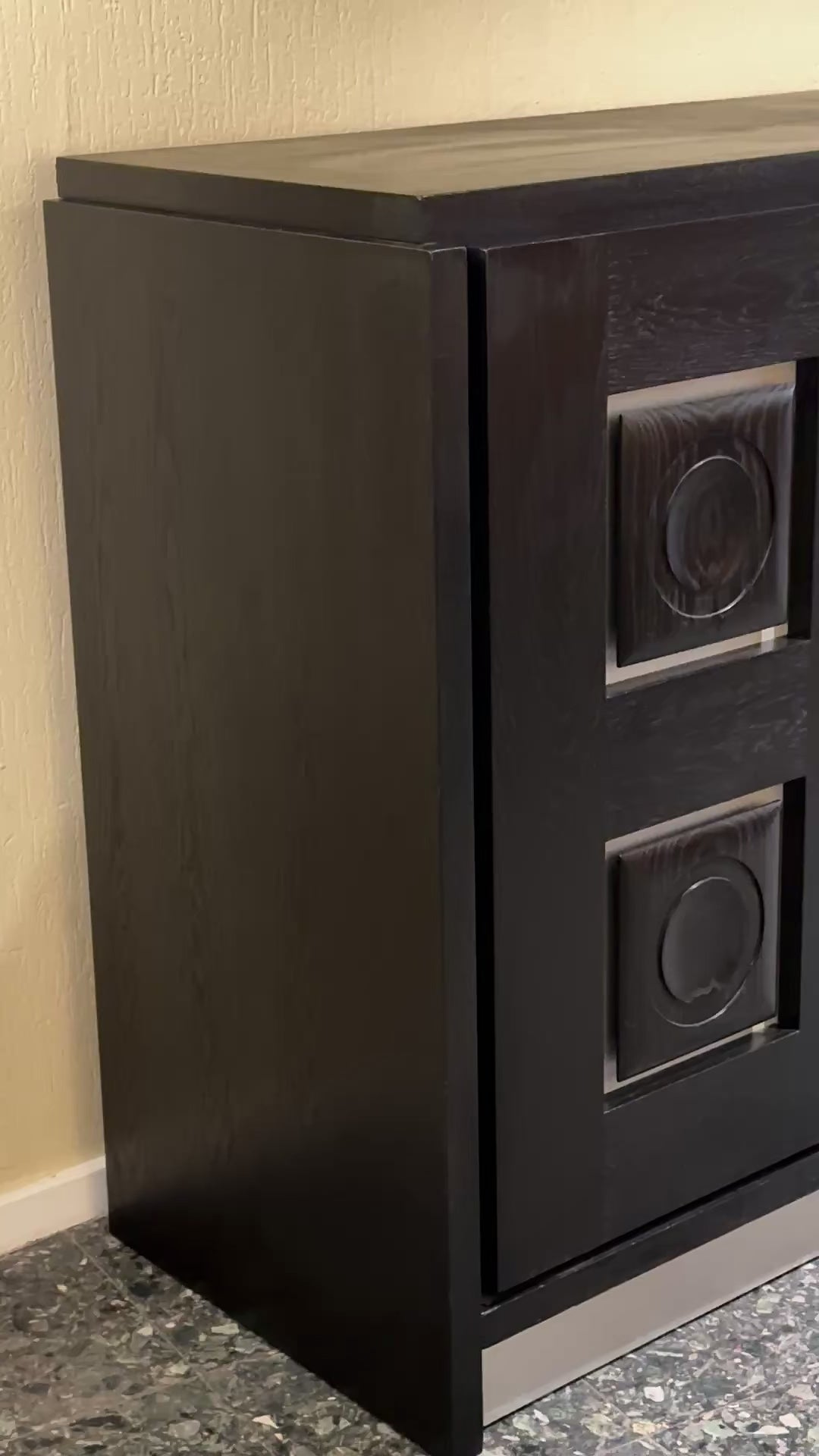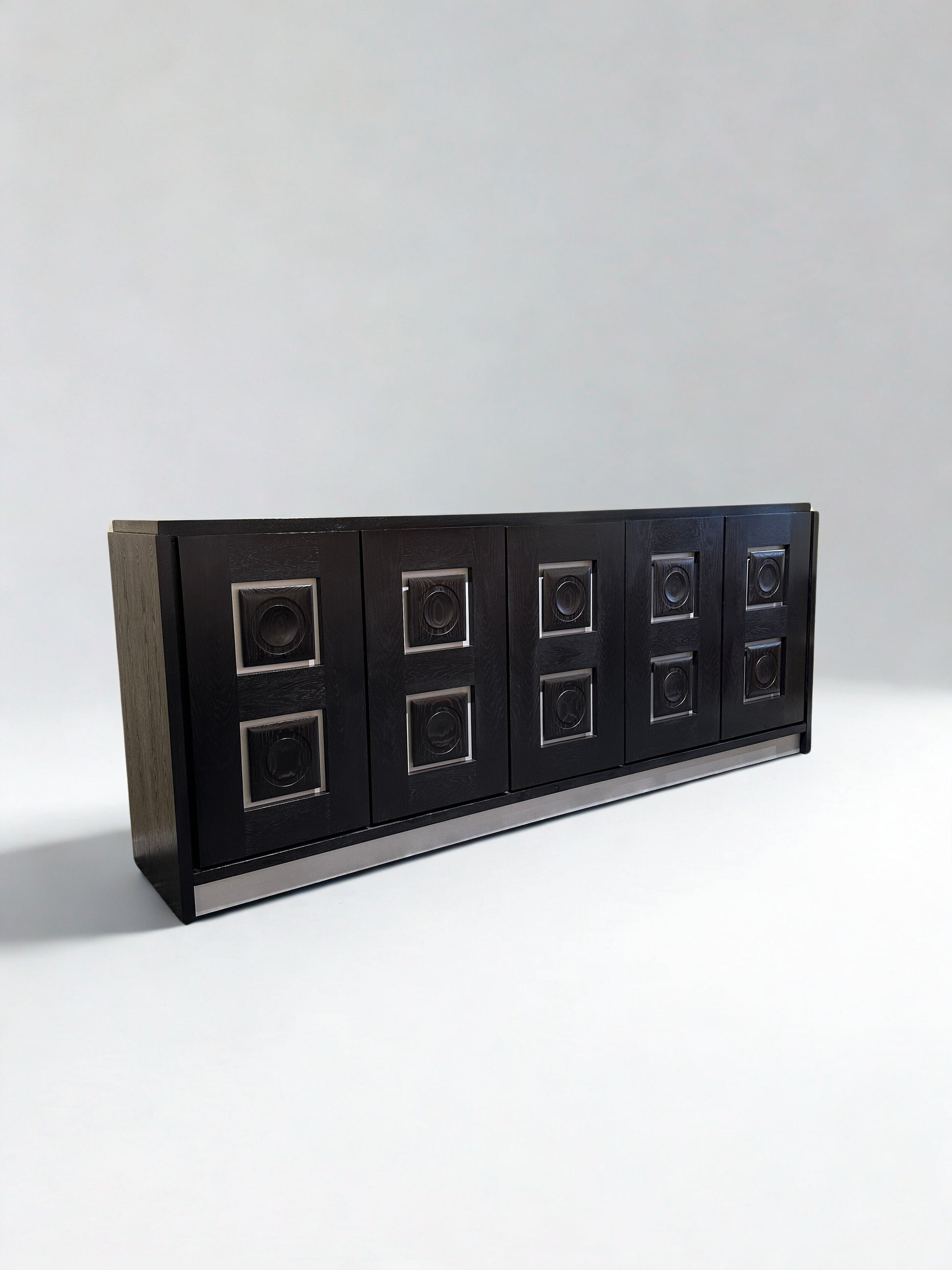 Impressive brutalist sideboard in black stained oak, featuring a bold rhythmic front with sculpted panels and silver-toned details.