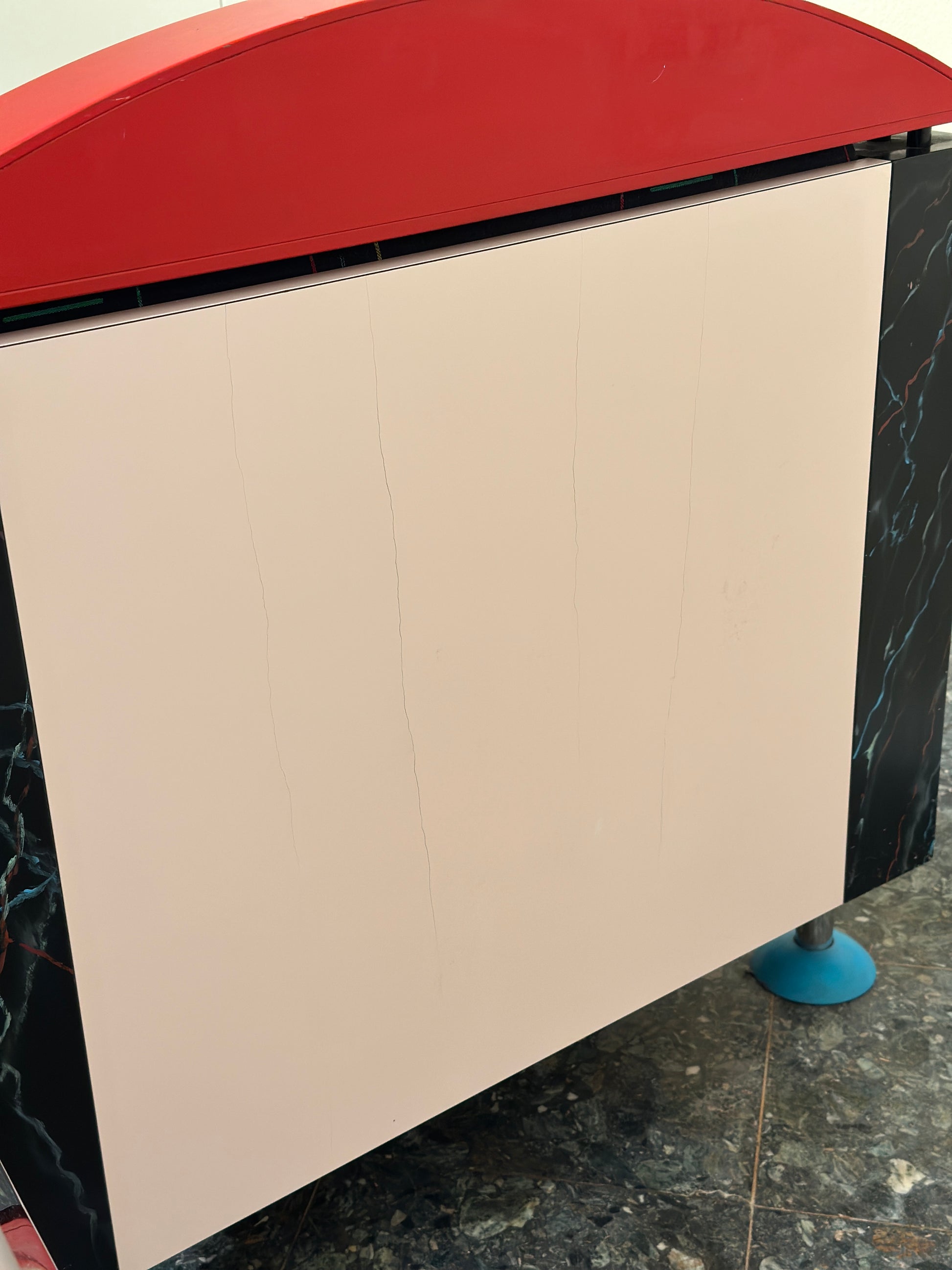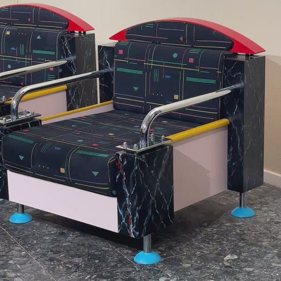 Striking pair of lounge chairs designed by Dutch architect Wim Hofman in the 1980’s. Defined by a bold architectural composition. Executed in black marble-look panels, chrome tubular armrests, and original geometric upholstery in primary colors. The design plays with contrast, rhythm, and form—hallmarks of Memphis-era postmodernism.