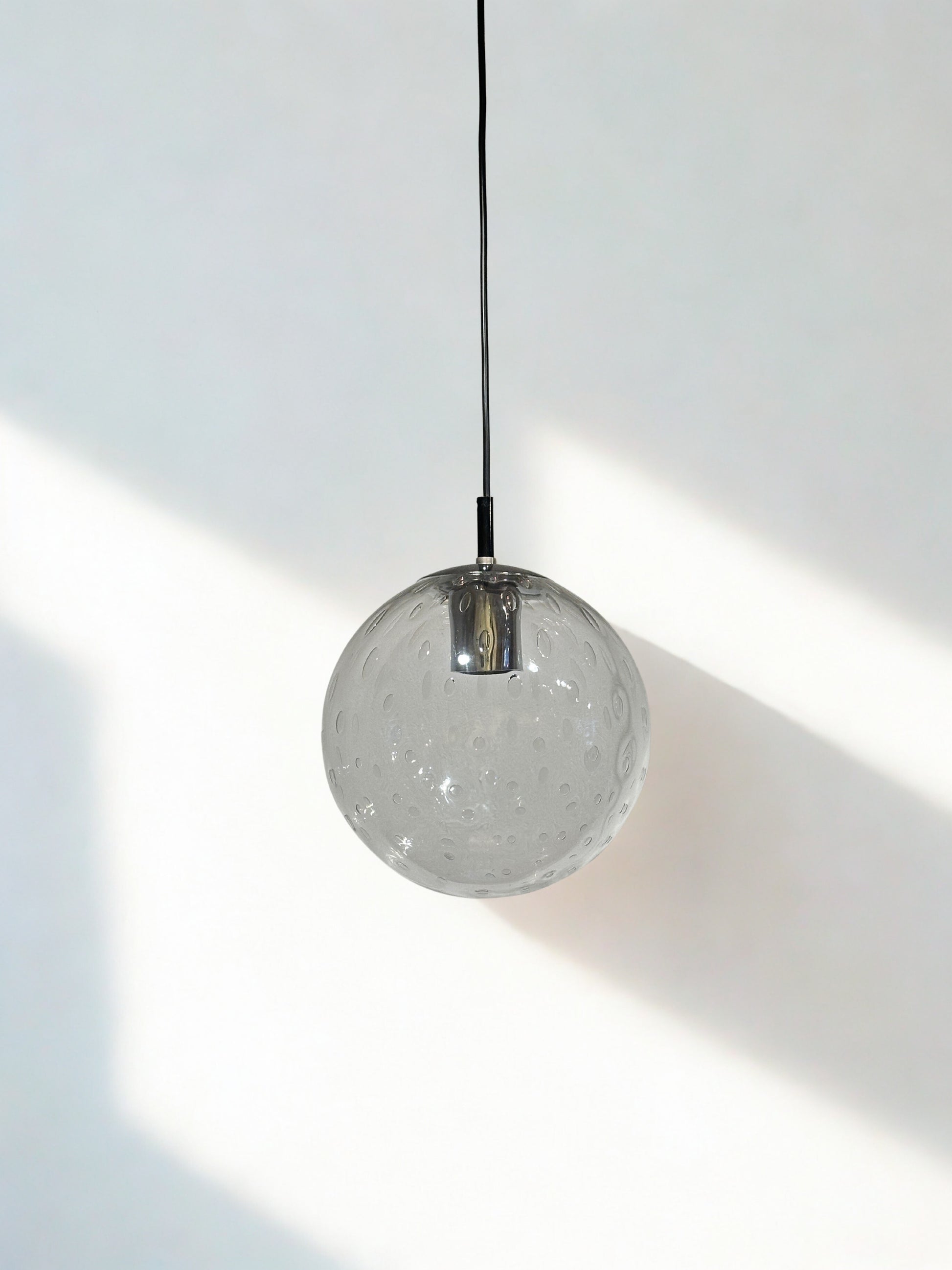 The glass globe is hand-blown and originates from the 1960–1969 production period in the Netherlands. Its style can be described as urban modern: sleek, timeless, and elegant.