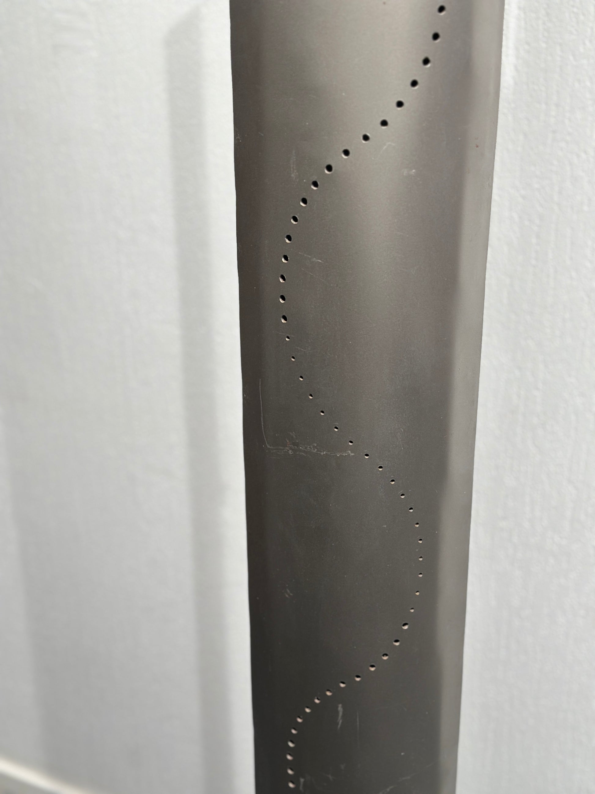 The steel column features a wavy line of perforations, creating a beautiful rhythmic play of shadow and light.